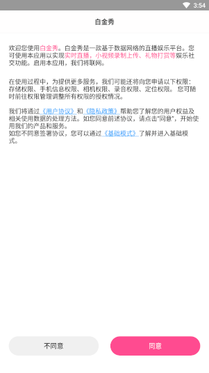 1、下载安装白金秀app并启动,阅读相关协议后自主选择是否同意。